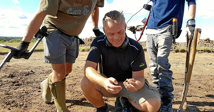 yderligere et hankeattache – og flere randfragmenter og bronzeblik. Ved den tredje afsøgning sidst i september fandt Michael Ejstrup Nielsen så en kraftig guldring, flere forsølvede nitter og igen